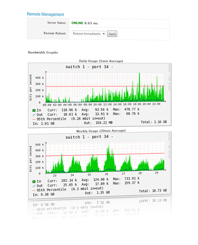 There’s nothing more frustrating than your server locking up and kicking you out of an SSH session. Now if disaster strikes you can hit the reboot button and your box will be hard rebooted. We’ve also included a few bandwidth graphs to show you transfer from the last day, week and month – ideal for keeping an eye on your bandwidth allowances.